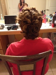 Then I pinned the curls into what I’ve started calling a curl-hawk. I made sure that none of the curls were pinned down too tightly. Next I gathered the hair at the bottom of her neck into a low-ponytail and pinned it under.