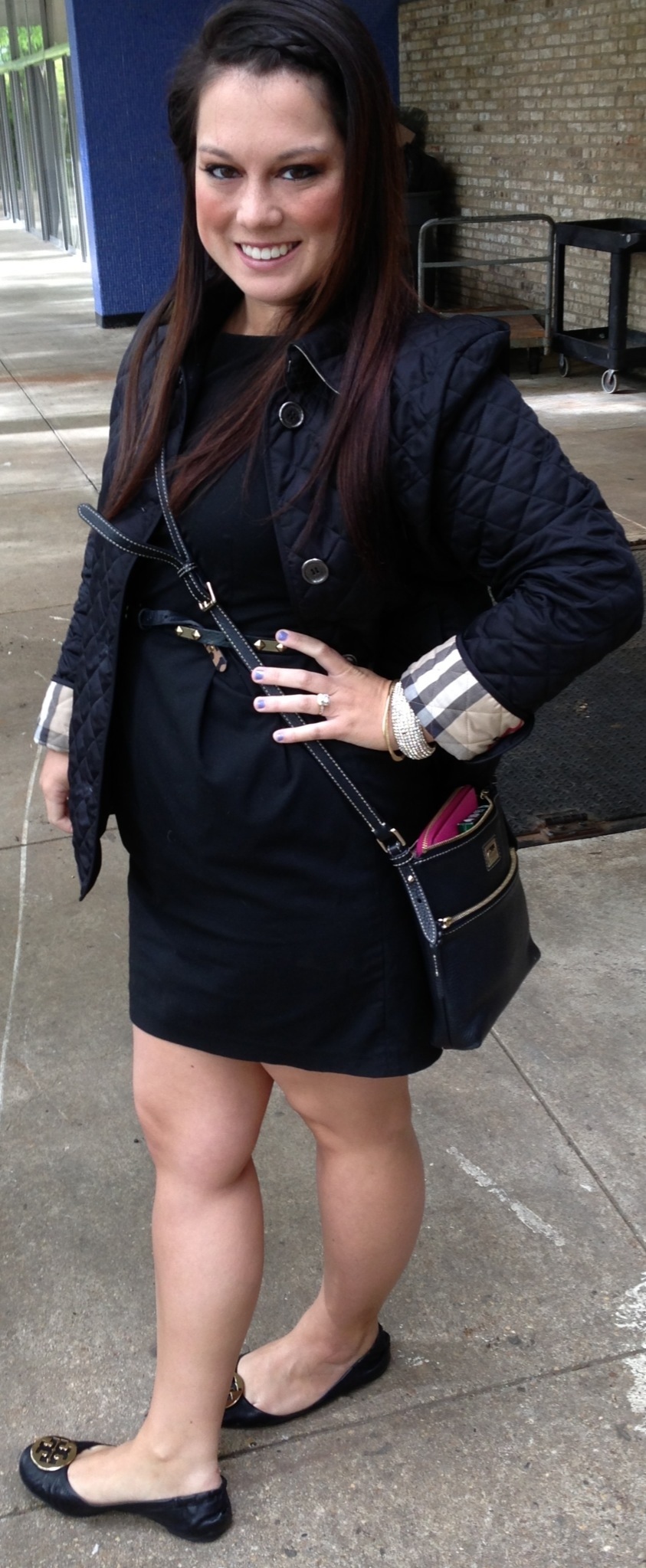 This Burberry jacket is my favorite jacket ever. I love it more than I could love a child (not a joke). As you will also notice, I love to wear gold. I will always try to bling out, and this is my way of blinging at work. That studded belt is fun and edgy, but with the dress/flats/jacket combo it tones it down enough to be work appropriate. This is basically my fall/spring wardrobe.